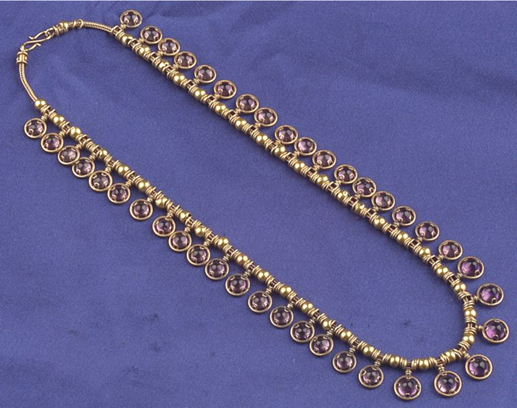 Archaeological Revival 18K gold and amethyst fringe necklace was found